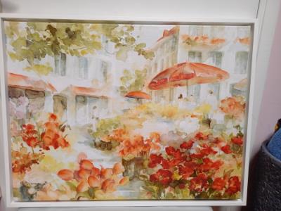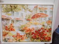 Tableau 85x64 . Couleurs accrochantes pour ce tableau . Entourage bois vernis blanc. Il capte la lumière et transmets de bonnes ondes.