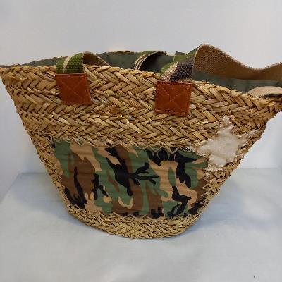Panier motif camouflage. Fermeture éclair pour sécurisé le contenu. On apprécie les larges anses du même motif.