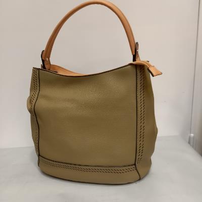 sac rectngualaire. 2 tons : kaki et beige foncé. 1 séparation intérieure. 1 anse et 1 bandoulière amovible.