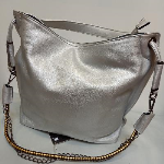 sac rectangulaire. Gris argent satiné. bandoulière et 1 petite anse. 1 séparation intérieure