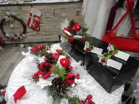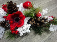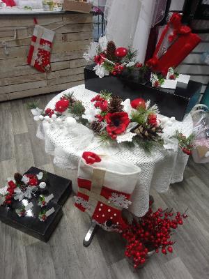 "Noël et la Nature des bois" : sapin, pomme de pin, baies, champignon🍄, hellebore rouge, ❄ en bois forment cet élégant centre de table (65cm/25)