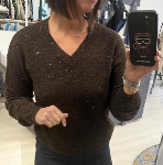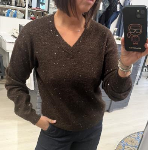 Ce pull col V à sequins et lurex or rose est très doux et lumineux . L’alliance du chocolat et de l’or rose lui donne un look incroyable ! Avec un pantalon habillé il sera parfait pour une soirée et assortie avec un jean brut il saura vous séduire pour être chic et décontracté lors de vos rendez-vous professionnels